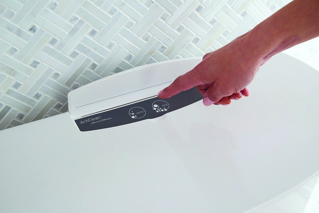 The new ActiClean Toilet from American Standard combines its VorMax flushing technology with a cleaning system that is fully integrated into the model, eliminating the need for manual cleaning or clip-on solutions. The cleaning control panel is hidden under a flip-up lid on the tank, where users can activate the system and choose from two cleaning-cycle options. The VorMax technology fills the whole bowl with cleaning solution and then siphons the cleaning agent out and rinses the bowl with clean water. The toilet currently retails for $700. americanstandard-us.com