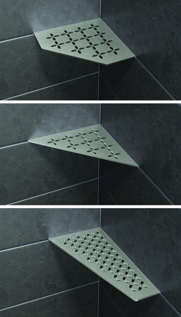The 5/32-inch-thick brushed stainless steel Schluter shower shelves are made to fit between rows of shower tile, and do not require additional materials or tools for installation. The rectangular Shelf-N fits inside Schluter’s Kerdi-Board-SN shower niche; the Shelf-E’s three configurations (shown) are made for corners; and the Shelf-W stands alone between tile rows. The shelves complement Schluter’s Style shower grates, and curve and floral patterns match the point and linear drains with the same designs. Pricing ranges from $85 to $130. schluter.com