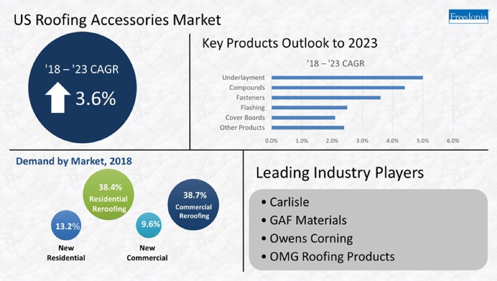 Demand for roofing accessories in the United States is projected to increase 3.6% annually through 2023 to $6.5 billion, according to a forecast from The Freedonia Group. Demand for roofing accessories, such as roofing underlayment, fasteners, compounds, flashing, and cover boards, will be fueled by increases in overall roofing activity.
