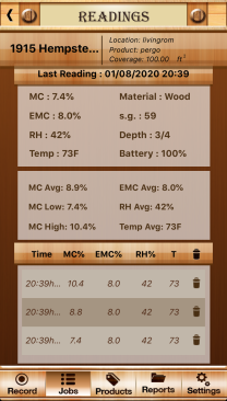 The author likes the Wagner Orion 950 pinless meter for its ability to save and record several readings, including moisture content, equilibrium moisture content (EMC), relative humidity, temperature, time, date, and location. Calculated results can be deliver on the author’s phone (left) and reports can be sent via email.