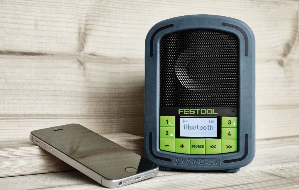 The SYSROCK radio offers sound clarity with a 2.5″ 10 Watt 8 Ohm Neodymium speaker and Digital Sound Processor (DSP); an easy-to-use big button design; and dual-source power abilities to use either its cord or Festool flat pack batteries (10.8 – 18.0 volt)