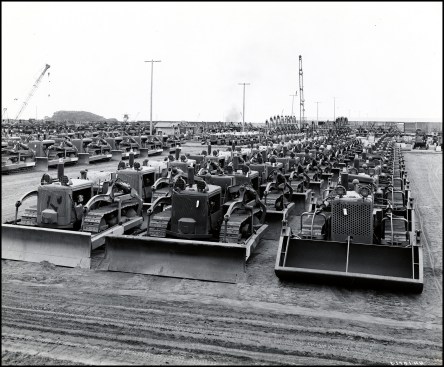 The Allies deployed more than 100,000 tractors during World War II. Earth-moving equipment manufacturers like Caterpillar, International Harvester, Allis-Chalmers, and LeTourneau provided the mechanical muscle behind the land-clearing and construction efforts of Army Corps of Engineers in Europe and the Naval Construction Battalions (NCBs) or Seabees in the Pacific. In this photograph from 1944, International Harvester TD-9 crawler tractors equipped with bulldozer blades and front-end loaders are lined up in large groups in preparation to be shipped to various Pacific battle zones.