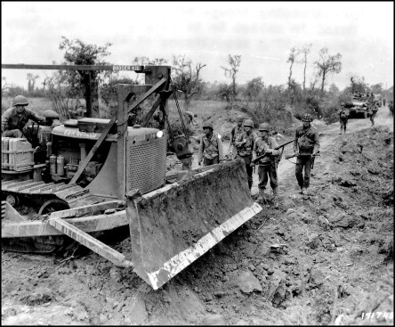 âVictory seems to favor the side with the greater ability to move dirt,â Major General Eugene Reybold, the head of Army Corps of Engineers, declared in 1944. The Army Corps used the bulldozer on the front lines in Europe to crush barriers to forward advancement. Here, a Caterpillar D7 with angle-dozer equipment and a LeTourneau CK7 blade fills bomb craters on a road in Normandy west of Saint-LĂŽ as soldiers from a stalled convoy look on.