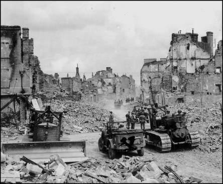 General Reybold further stated, âBy the war’s end, it was evident that American construction capacity was the one factor of American strength which our enemies consistently underestimated … the one for which they had no basis for comparison. They had seen nothing like it.” In this photograph from 1944, two US Caterpillar D7s clear the bombed-out streets of Saint-LĂŽ, France. The Army Corps would go on to use the bulldozer to help remove some 183 million cubic yards of stone and rubble in Berlin, Hamburg, Cologne, and Dresden alone after the war.