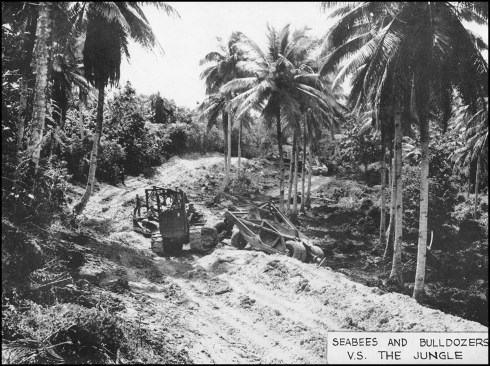In the Pacific, the Seabees cleared enough jungle with bulldozers to build more than 400 bases, 100 air strips, 235,000 roads, 700 acres of warehouses, housing for 1.5 million men, and storage tanks for 100 million gallons of gasoline as the Navy and Marines island-hopped towards Tokyo.