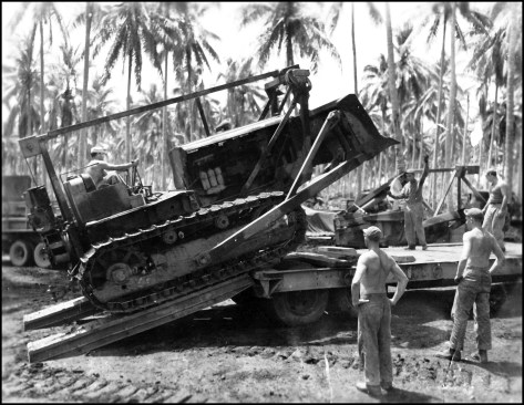 The Seabees were formed shortly after Pearl Harbor, in large part because Navy leaders worried civilian crews would not function in a tight cohesive unit under fire. Also, as civilians, work crews would be legally prohibited from engaging in combat for fear of capture and being treated as guerrillas (rather than as military prisoners of war) and thereby risk being summarily executed. It was the first time the U.S. military had absorbed construction industry personnel wholesale, rather than developing its own engineering crews. As the war progressed, their ranks grew to a wartime peak of more than 250,000 men with the majority deployed in the Pacific. Here, Seabees load a dozer onto a lowboy trailer in Guadalcanal (February 1945).