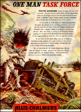 We of Allis-Chalmers are proud of these men who operate the tractors we build. Our hatâs off to Uncle Samâs one-man task force, the bulldozer driver. And our sleeves are rolled up in sincere effort to live up to his example.â