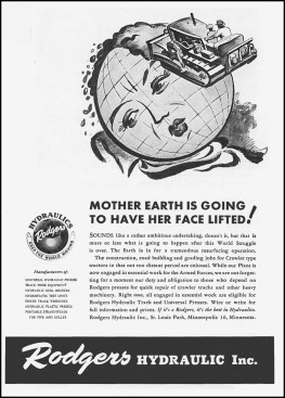 This 1944 ad for hydraulic tractor equipment, published in Military Engineer magazine, foretells of a world of opportunity for postwar earthmoving work.