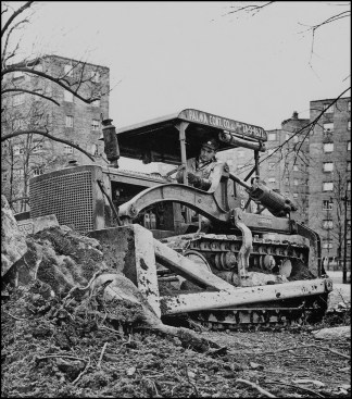 Earth-clearing skills honed overseas were put to use when these land-altering machines and their highly trained operators returned home âto wage war on the American landscape.â Urban planners made a correlation between blighted American cities and bomb-damaged European ones, recommending clearance and rebuilding for both. The Housing Act of 1949 provided for two-thirds of the cost of clearing land and making possible the assemblage and write-down of large urban parcels to attract privately financed new development. In this 1952 photo, a bulldozer operator removes demolition debris to make way for the Cross Bronx Expressway, part of a massive development scheme for New York City.