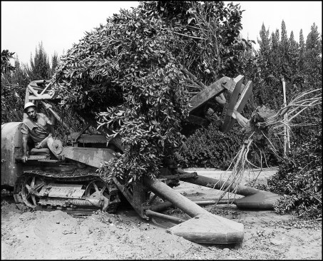 In Orange County, Calif., the complete land-clearance process (including tree uprooting, refuse removal, and land grading-typically) cost developers about a dollar per orange tree, or roughly a hundred dollars per acre. This was a tiny part of the total development costs, making the destruction of orchards an economical and consequently, almost forgettable step in the home-building process. In this photo, California mechanic Weldon Field uses a tractor-mounted stump puller he developed to uproot an orange tree.