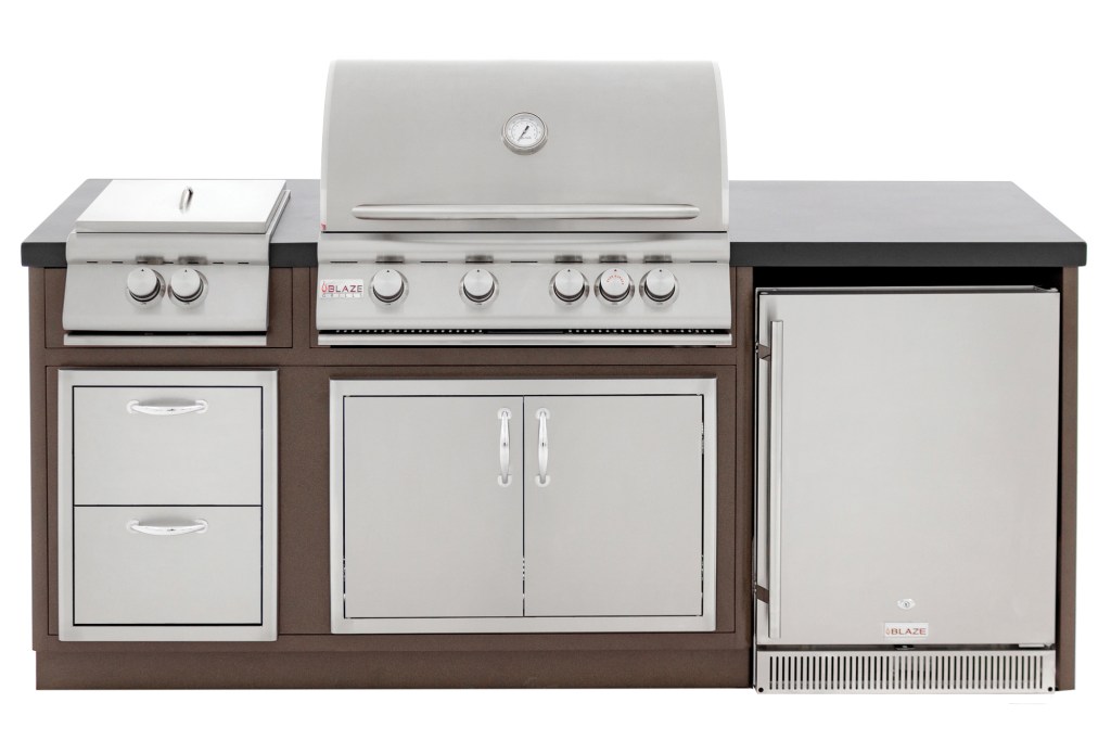 The lightweight, all-aluminum Blaze Island from Blaze Grills houses five burners, a refrigerator, and storage space in a welded frame. Adjustable feet facilitate leveling, while powder-coated panels with a copper vein finish, textured black countertops, and screened rear venting complete the package. We found the Blaze Grill Island (including a four-burner stainless steel grill, power burner, and 24-inch refrigerator) online starting at about $8,400. blazegrills.com