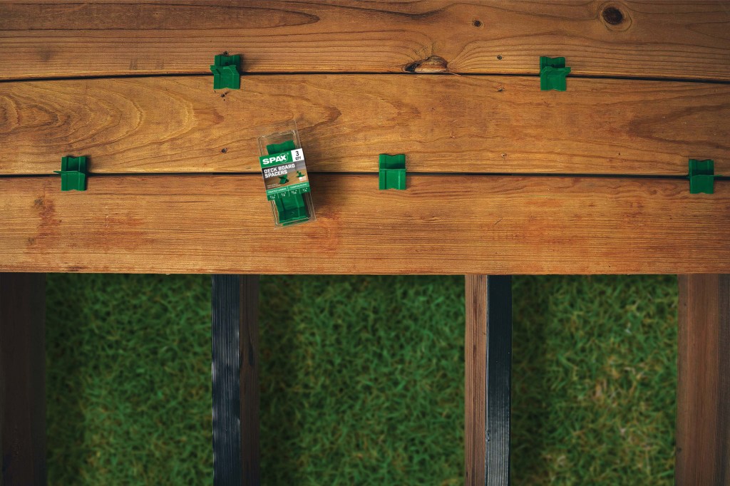 Builders use different jigs and methods to provide a gap between deck boards to allow debris and water to fall through and to give the boards room to expand as they absorb moisture. With four “wings” of different sizes, reusable Spax deck spacers can help ensure uniform gaps of four common dimensions—1/16 inch and 1/8 inch for pressure-treated boards and 3/16 inch and 1/4 inch for composite or PVC boards. Each wing is notched to help with fastener alignment. A hole in one wing is handy for pulling out a spacer if it becomes stuck. The spacers come three in a package. spax.us