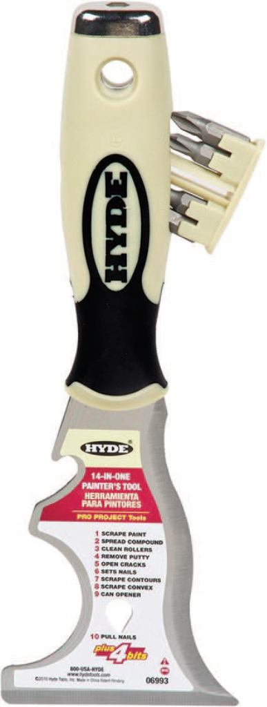 Based on the numbers alone, Hyde’s 14-in-1 Multi-Tool is nearly three times as good as the original version of this painter’s tool — the venerable “5-in-1.” The new tool can scrape paint, open cans, excise rot, back up a pry bar, and serve as a makeshift screwdriver; a pull-out drawer in the handle stores four bits. It costs about $11. Hyde Tools, 800/872-4933, www.hydetools.com.
