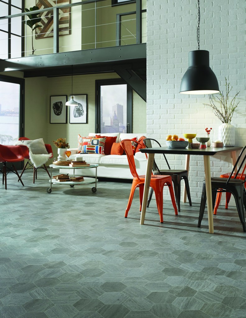 Revive from Mannington is a resilient vinyl collection of seven patterns that offers a more budgetfriendly way to achieve bold tile looks. Deco is a large-format pattern of symmetrical intertwined florals; Lattice sports a small basketweave pattern; and modern Hive (shown) resembles limestone in an updated take on a honeycomb pattern. In all Revive patterns, the flooring’s wear layer incorporates aluminum oxide to help provide scratch resistance. Check with dealers for pricing. mannington.com