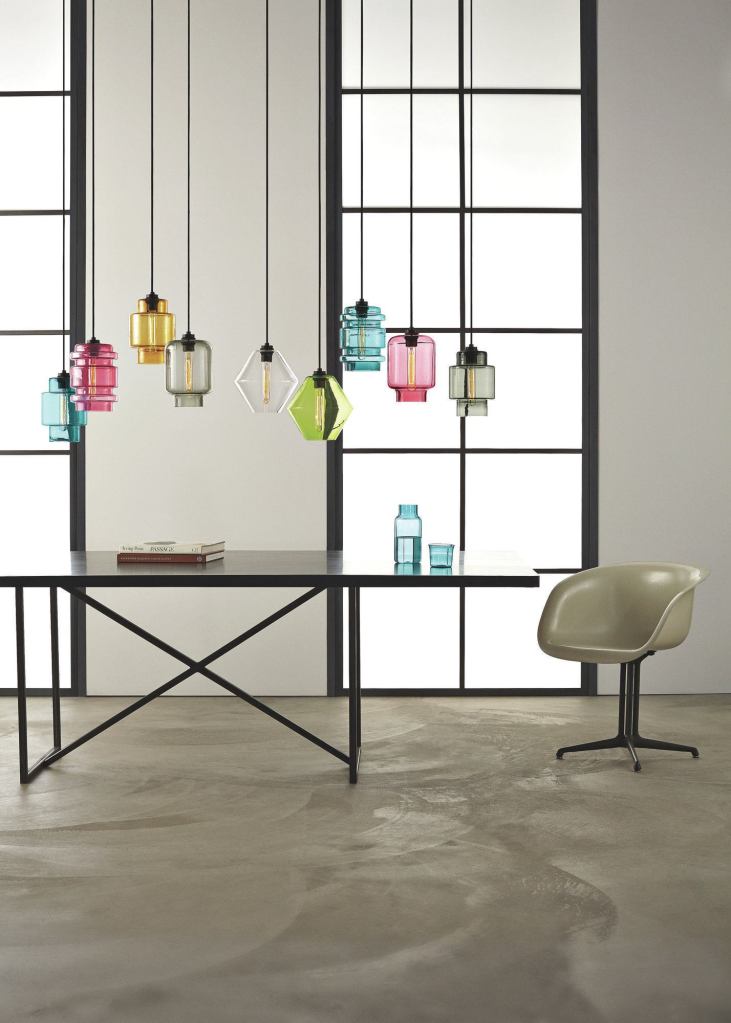 Crystalline Series hand-blown pendants come in four geometric shapes measuring 6 3/4 or 9 3/4 inches wide and 9 1/4 inches high. The black cord can be cut on site and terminates in a black ceiling canopy. The pendants are fitted with the maker’s dimmable tubular incandescent Beacon Bulb and also accept Plumen CFL bulbs. Available in nine glass colors. Prices range from $550 to $650 each. nichemodern.com