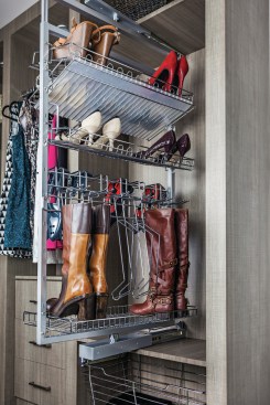 Hardware Resources’ Revolving Boot and Shoe Rack is a 28-inch-wide rack that pulls out of the closet and pivots 180 degrees, allowing easy access to every pair of shoes and featuring the ability to store twice as many shoes as traditional racks. The system is available in four, eight, or 12 shelves in either a white powder-coat or silver powder-coat frame with chrome shelving, or as a 61-inch-high revolving rack that holds more than 20 pairs of footwear in a silver powder-coat frame finish with chrome shelving. Optional plastic liners help keep shoes and boots clean.