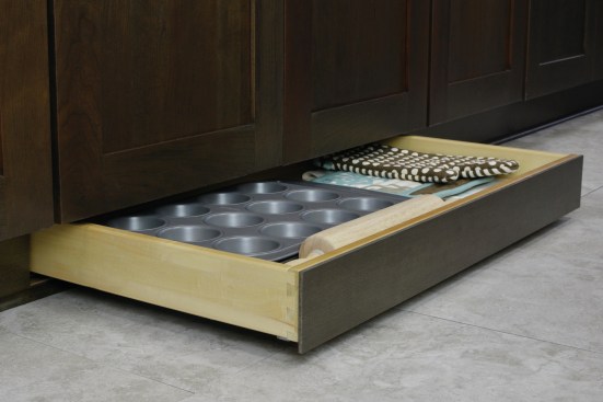 The Toe Space Drawer from Dura Supreme Cabinetry increases kitchen cabinet storage by utilizing a space that is commonly forgotten. Fitted along the bottom of any straight 18-, 21- or 24-inch cabinet, the extra drawer increases storage without adding more square footage to the kitchen. The touch-latch mechanism allows users to open the drawer with their foot, eliminating knobs or handles.