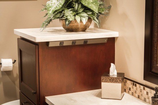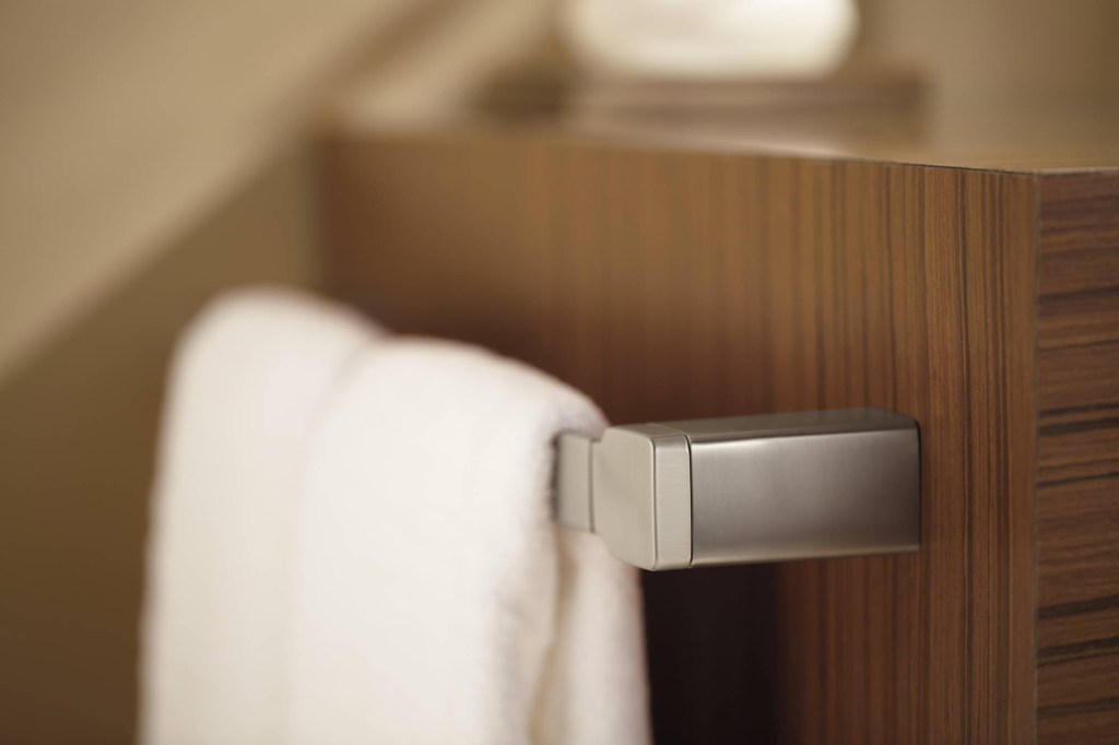 Just as important as a set of fresh guest towels is having those towels in convenient places. In addition to bars or warmers on the wall for large bath sheets, consider mounting a towel bar to the front of the vanity. Hand towels and washcloths will be within easy grasp, and guests won’t have to fumble around with dripping hands and faces. Bath accessory companies and those that offer cabinet hardware will have options in a variety of styles and finishes to complement the bath design. Moen’s 90 Degree Collection towel bar is shown.