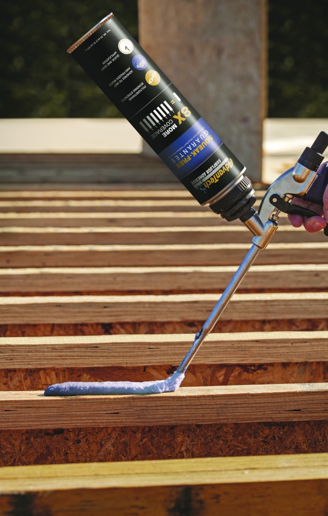 AdvanTech’s Subfloor Adhesive is a foam-to-gel polyurethane adhesive that expands to fill minor gaps, reducing the likelihood of squeaks. When the adhesive is used with engineered joists and AdvanTech subfloor panels, the company offers a 10-year squeak-free guarantee on the panel-to-joist connection. The manufacturer also says that the adhesive is formulated to stick to wet and frozen lumber. The foam has a 20-minute open time. It retails for around $20 per can. huberwood.com