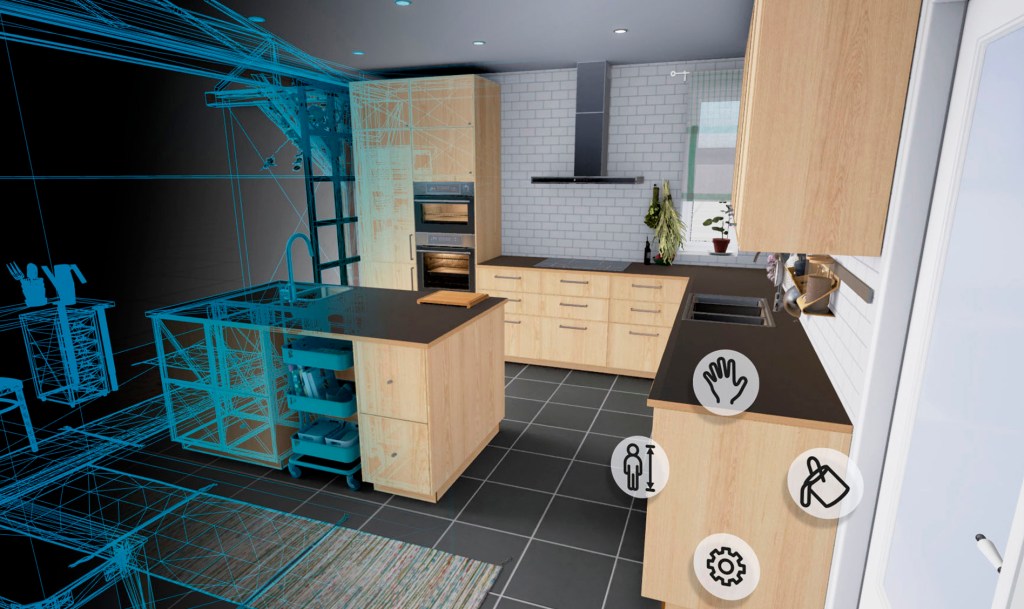 Right now, the Ikea VR Experience can be used by anyone with an HTC Vive headset and a PC. The app immerses the user in life-size version of one of three differently-styled Ikea kitchens, and allows them to change the colors of cabinets and drawers with a click. Designers who focus on universal design will appreciate the perspective feature, shown at right, which gives users the ability to view the kitchen from different heights, such as that of a 3.3-foot-tall child or a 6.4-foot adult.