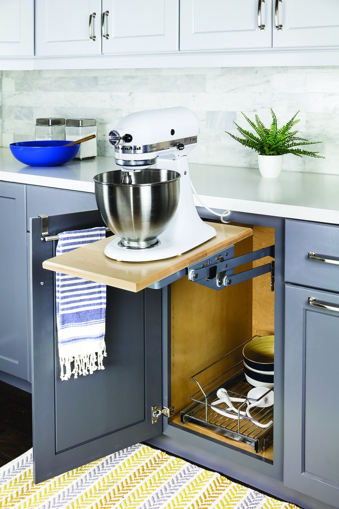 Hardware Resources’ Soft-Close Mixer/Appliance Lift not only allows bulky kitchen appliances like stand mixers, blenders, and food processors to be stored out of sight when they’re not needed, it also provides mechanical assistance to raise them to counter height for use. The chrome-finished system is compatible with frameless or face-frame cabinetry and attaches to a shelf that is at least 3/4 inch thick and less than 20 1/2 inches long. The spring-loaded lift can support up to 45 pounds and locks in place just below counter level. It costs $150. hardwareresources.com