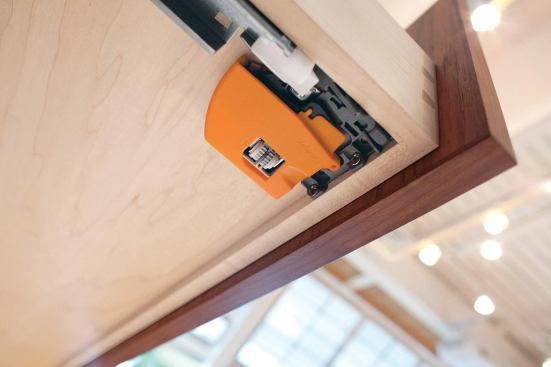 Blum’s improved Tandem plus Blumotion soft-close full-extension undermount drawer runners — due to roll off production lines in North Carolina by the end of summer — will allow “four-dimensional” adjustment using simple built-in levers and dials. In other words, they’ll allow you to adjust drawers from side to side and tweak their height, tilt, and depth (which should be especially useful for aligning inset drawer fronts). The runners are designed to meet or exceed ANSI/BHMA test specs with a 100-pound static load for good stability and minimal sag. They’ll cost $15 to $40 per pair.