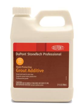 Instead of water, mix DuPont’s StoneTech Professional Stain Protecting Grout Additive with your sanded or unsanded cement-based grout to eliminate the extra step of sealing the grout after it cures. The additive won’t affect the grout color, the company says. A 27-ounce bottle costs about $25, a 67-ounce bottle about $50.