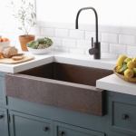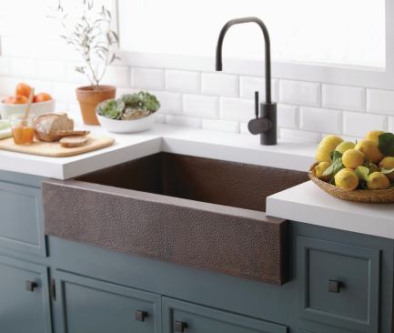 A contemporary take on the traditional farmhouse sink, the new Paragon undermount apron-front sink by Native Trails is made of 16-gauge hand-hammered recycled copper. Its apron drops just 61/2 inches to allow easy installation in standard cabinetry. It costs about $3,000 with an “antique” finish or $4,300 with a brushed-nickel finish.