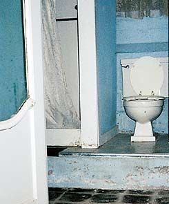 Figure 1. A basement toilet on a platform (top) installs easily but is awkward to use. Using an in-floor basin with a sewage grinder pump creates a normal appearance and doesn’t impinge on headroom (bottom). | |