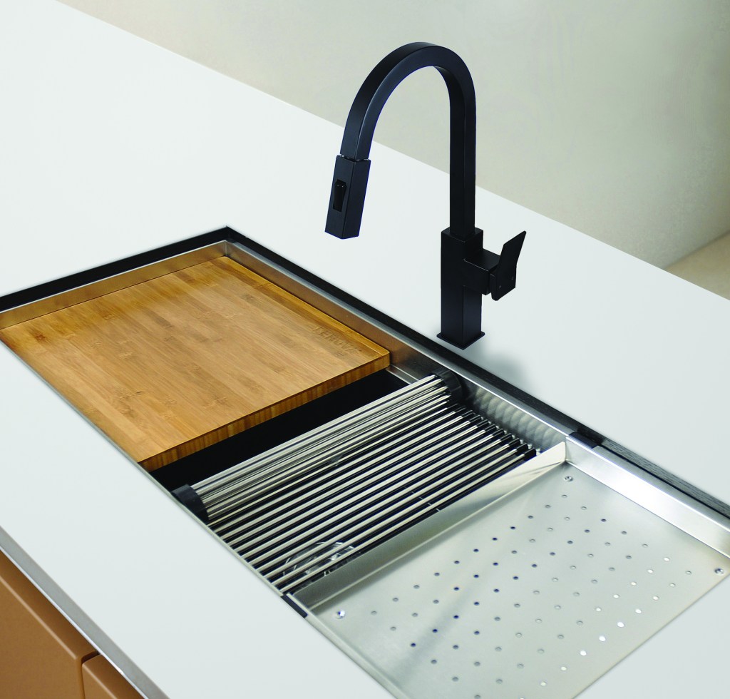 Lenova’s newest kitchen faucets, the SK222 and K410, are also the first to offer its new matte black finish. The manufacturer says that its proprietary PVD processing makes the finish durable and easy to maintain. Both faucets are made from 304 stainless steel and feature an arched profile, a two-function sprayer, 360-degree swivel spout, and side control lever. The K410 has a rounded cross section, while the SK222’s (shown) is angular. Pricing ranges from $325 to $425. lenovasinks.com