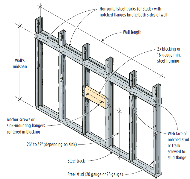 Q. I used 25-gauge steel studs to frame the partition walls in an upstairs renovation. Now my client wants to install a wall-mounted lavatory in the bathroom. What’s the best way to reinforce and block the wall so I can hang the sink?