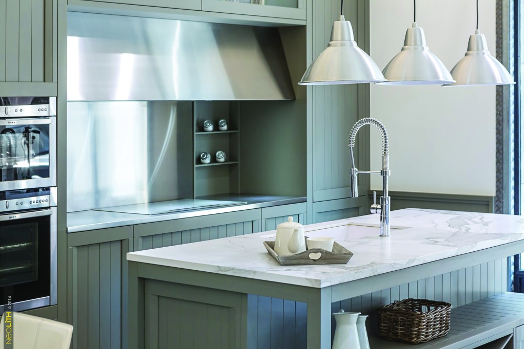 Neolith is one of a new class of “Sintered” materials made by placing the ingredients of glass, porcelain, and quartz under extremely high heat and pressure (2,200°F and 5,900 psi). The result is a uniform, stone-like slab with excellent scratch, chemical, and heat resistance. It’s sold to licensed fabricators in three thicknesses: 3mm (for furniture and walls), 6mm (flooring), and 12mm (countertops). The 12mm (1/2 inch) material weighs 8 pounds per square foot. The manufacturer says the cost should be comparable to quartz. neolithcountertops.com