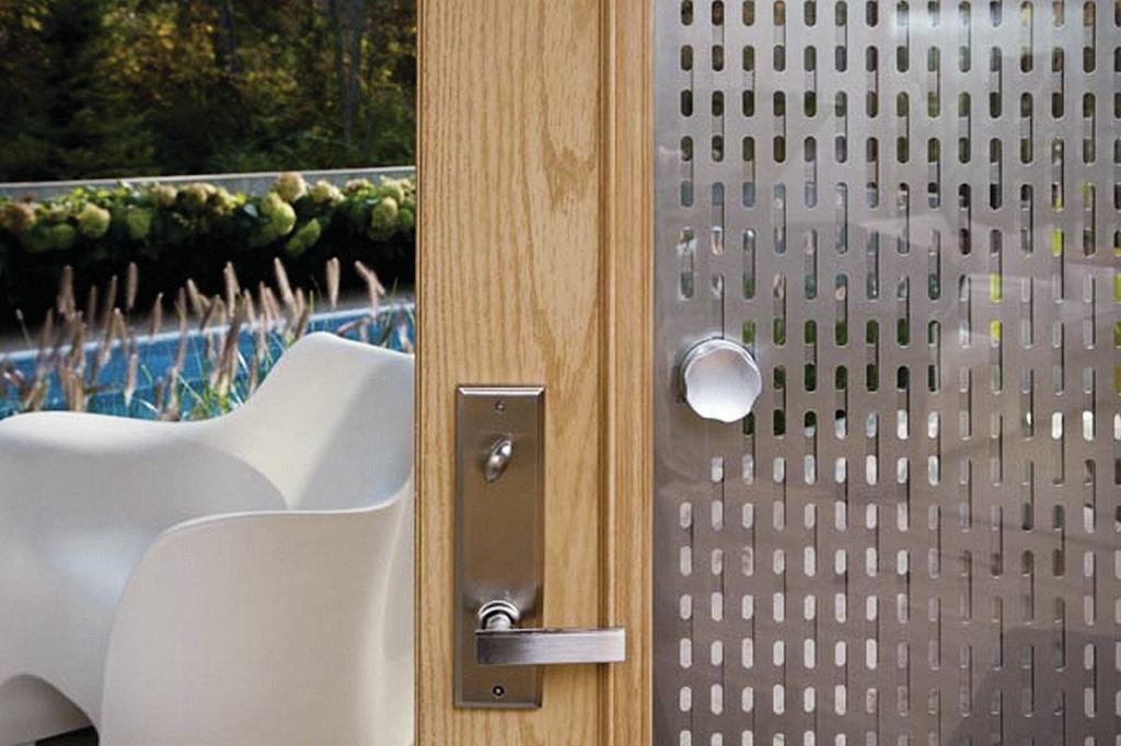 The modernistic Array door light system can be retro­fitted to any door that will accept a 22-inch by 64-inch glazing panel. It consists of two sliding panels of perforated, powder-coated aluminum placed between panes of tempered low-e glass. A simple interior control knob lets the user adjust light levels by setting the perforations to open, closed, or anywhere in between. Cost for the panel is $600.