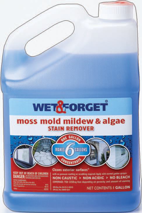 Low-Impact House Wash. Pressure-washing is fast and effective, but it can also be destructive. If you’re not in a hurry, Wet & Forget offers a gentler alternative. According to the maker, you can apply this noncaustic, nonacidic cleaner to any exterior surface and let the wind and rain handle the scrubbing and rinsing. The company cautions, however, that it often takes two to three months to get rid of stubborn stains like mold and mildew. A one-gallon jug costs about $30. Wet & Forget, 888/727-8524, wetandforget.com