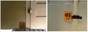 The PLS180 (left) can project level lines, plumb lines, or plumb and level lines at the same time. The detector — shown at right on a 2×2 grade rod — is used to locate the beam at long distances or in bright sunlight. Detector