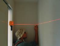 Magnets in the L-bracket hold this laser to the metal corner bead. Because the horizontal beam spreads beyond 180 degrees, the author is able to lay out shelf cleats without moving the tool. While I like the bracket, it could be better. The rubber surrounding the magnets keeps them from scratching metal but leaves marks on textured drywall surfaces. I’d rather have more ways to mount the laser on the bracket, and I wish the screw in the bracket could be easily reversed so the arm containing the magnets could be flipped up or down. Also, additional threaded inserts in the housing — say, on the top and side — would allow for greater flexibility in positioning the device.