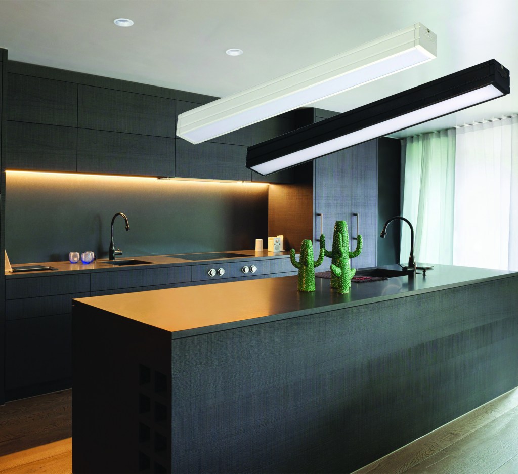 Nora Lighting’s Bravo Frost LED 120V Linear Fixture is an undercabinet trim light that features a frosted lens and asymmetrical internal reflectors to deliver even illumination, making it ideal for polished countertops, such as granite and stone. The trim lighting is less than an inch deep, for a contemporary look, and comes in four lengths—12, 18, 24, and 32 inches. Each fixture has a self-contained electronic driver and produces 500 lumens at 7 watts per foot; units are linkable up to 400 watts (about 50 feet) and dimmable with an ELV dimmer. The extruded aluminum housing comes in either a bronze or a white finish. Pricing varies by size. noralighting.com