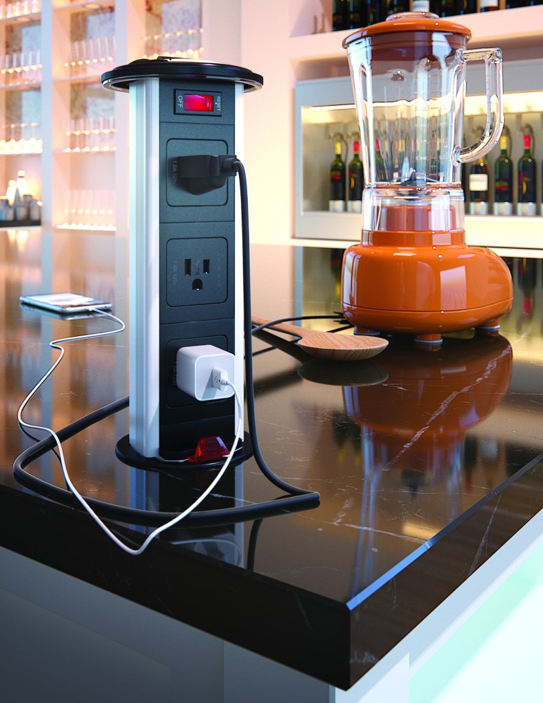 Doug Mockett & Company aims to add electrical function and convenience to countertops with the PCS34 Kitchen Power Grommet. To access the three electrical outlets, users simply pull up on two metal handles. When finished, users press the release button to drop the unit back down. While closed, the lid sits only 5/8 inch above the surface, and a clear rubber ring around the top creates a watertight seal, according to the manufacturer. It is available with clear, black (shown), or satin aluminum trim rings. Prices start at $135. mockett.com