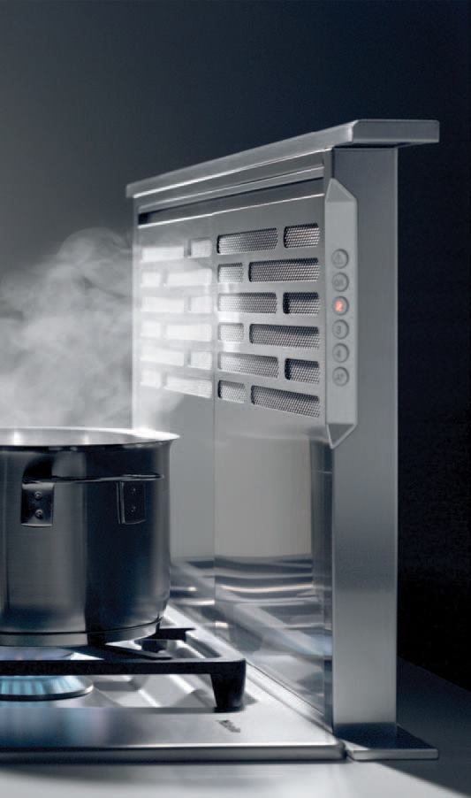 Disappearing Vent Hood. Miele’s stainless steel Telescopic Downdraft Hood tucks away beneath the countertop until it’s needed, at which point it pops up with the touch of button, topping out at 14 inches above the cooking surface. The four-speed fan includes a 15-minute delayed shutdown feature. The hood comes in 30-inch (DA 6480) and 36-inch (DA 6490) sizes with a 500-cfm or 1,000-cfm blower assembly. Prices range from $1,700 to $2,300. Miele, 800/843-7231, mieleusa.com
