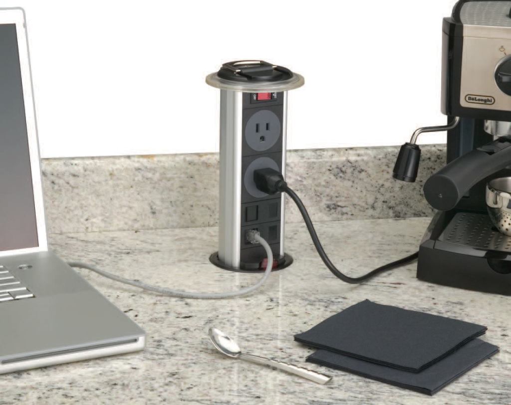 Pop-up Power. The Kitchen Power Grommet provides convenient access to electricity on virtually any countertop. It pops up and clicks into place when power is needed and disappears when it isn’t. A gasket keeps out spills when the unit is closed. Model PCS34 ($127) has three receptacles, and model PCS34A ($140) has two electrical outlets and two Category 5e data modules. Note that the product is intended for retrofit purposes and may not satisfy all local electrical codes. Doug Mockett & Co., 800/523-1269, www.mockett.com