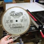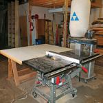 When setting up the saw, we always bolt a homemade melamine out-feed table to its convenient L-shaped rear rail and hook a Delta dust collector to the 4-inch dust port. This setup needs some space, so on site we often convert the living room or garage into our ripping station.