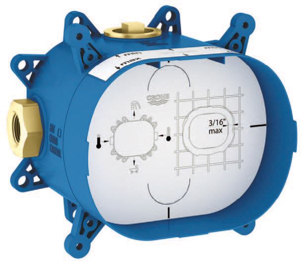 Simplified Rough-In. The new GrohFlex universal valve system uses a one-size-fits-all rough-in box to serve a wide variety of tub and shower fixtures. Because the product accommodates so many different options, it reduces delays caused by indecisive clients. Five “Bath Solution Kits” are available for single- and dual-outlet applications and custom showers; each offers three trim styles and four finishes. The rough-in box lists for $135; trims range from $160 to $475. Grohe America, 630/582-7711, groheamerica.com