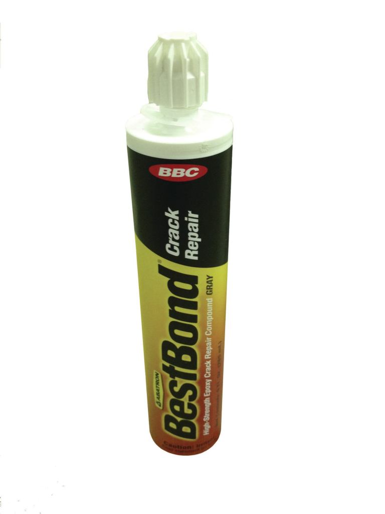 Abatron’s BestBond Crack Repair liquid epoxy concrete-repair compound is applied with a standard caulk gun. Because it will slump when applied on walls, it’s recommended for horizontal applications, like cracks in garage or basement floors. It dries to a hard plastic, so it shouldn’t be used where a flexible joint is needed. A 16-ounce tube fills 10 to 15 linear feet of a 1/4-inch by 1/4-inch crack and costs $13.