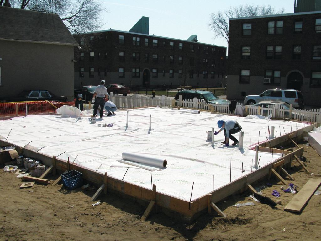 Florprufe polyolefin vapor barrier glues itself to the underside of a concrete slab — so if it tears, any moisture that gets through won’t migrate. A 1-mil protective coating keeps it from feeling sticky during construction; once the concrete is in place, pressure breaks down the coating and activates the adhesive. At 21 mils, the product is also quite thick. It comes in 4-foot by 115-foot rolls that cost about $700.