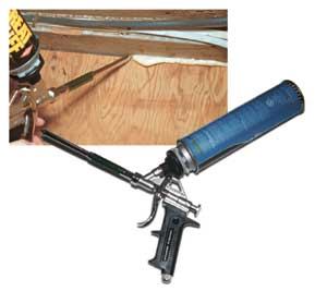As an added incentive, several years ago foam makers started offering pressurized polyurethane-based construction adhesives that are dispensed using the same guns, eliminating the repetitive strain of squeezing perhaps dozens of quart-sized tubes of subfloor or drywall adhesive. The adhesive bead is uniform and goes down quicker than traditional construction adhesive. If you have any doubts about how well it sticks, just get some on your hands.