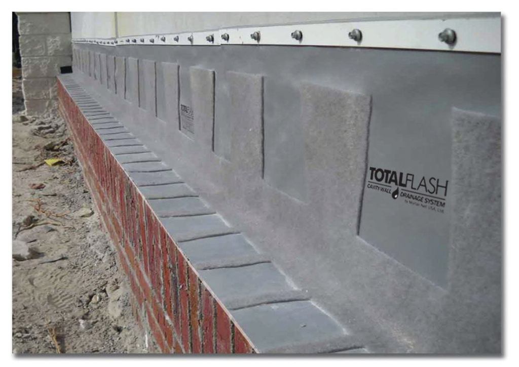 TotalFlash is a prefabricated flashing system for masonry cavity walls. It is available in either 50-foot rolls that include a drainage mat, integrated flashing membrane, mortar dropping collection mesh, and integrated weep tabs, or it can be ordered in pre-assembled panels that include a termination bar and drip edge. Costs per linear foot: $4.50 (panels), $2.90 (rolls). (Corner boots, end dams, and drip-edge outside corners are sold separately.) Mortar Net Solutions, 800.664.6638, mortarnet.com