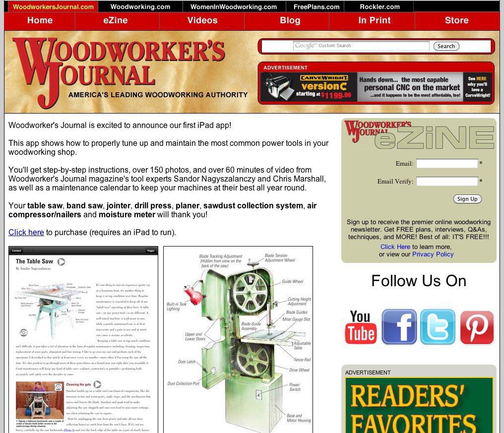 The new Power Tool Tune-Up iPad app from Woodworker’s Journal costs $4.99 and offers step-by-step coaching by Sandor Nagyszalanczy and Chris Marshall on how to tune and maintain table saws, compressors, pneumatic nailers, moisture meters, band saws, jointers, planers, drill presses, and sawdust-collection systems.
