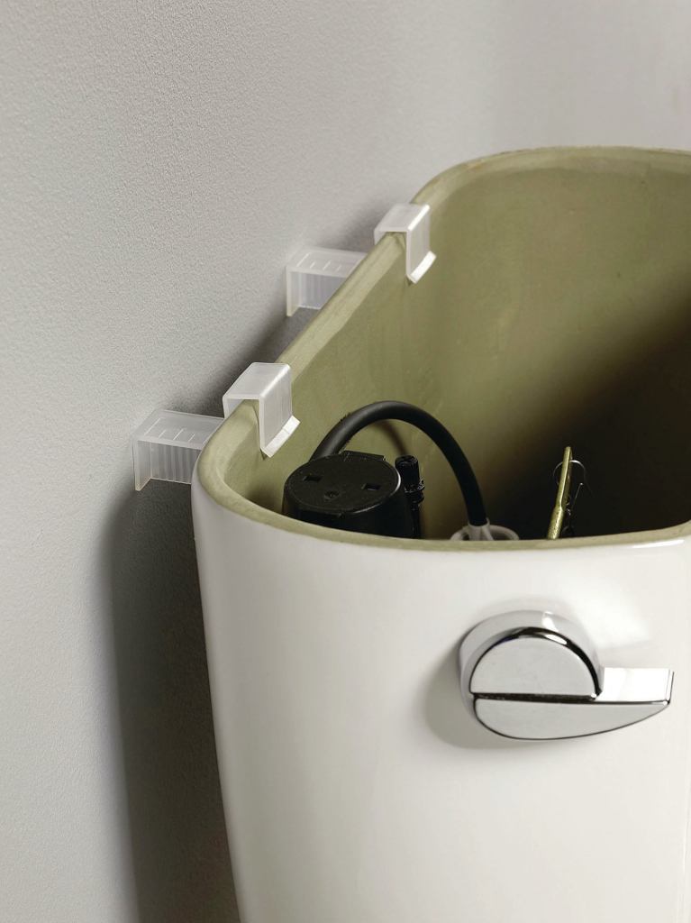 Contemporary toilets have smaller tanks than older models, so placing a new toilet on an existing flange can leave a gap between tank and wall. Leaning on the tank will strain the bolts that connect the tank and the bowl, deforming the gaskets and causing leaks, which over time can deform the gaskets that keep water from leaking through the bolts. Secure-A-Tank plastic brackets hook over the lip of the tank to add the missing support. Cost: $20 for a three-unit pack. Vadco Innovations, 800.699.8232, secureatank.com