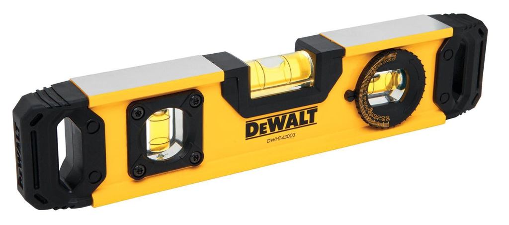 With the new DWHT43003, DeWalt has given the lowly torpedo level a significant upgrade. The tool has an extruded aluminum body with machined edges, and solid block vials that are guaranteed accurate to within 0.0005 inch/inch. One edge is V-grooved and fitted with magnets for work with metal and pipes. Other improvements include a magnified center vial and a rotating end vial with an angle scale on one side and a roof-pitch scale on the other. The level costs about $25.