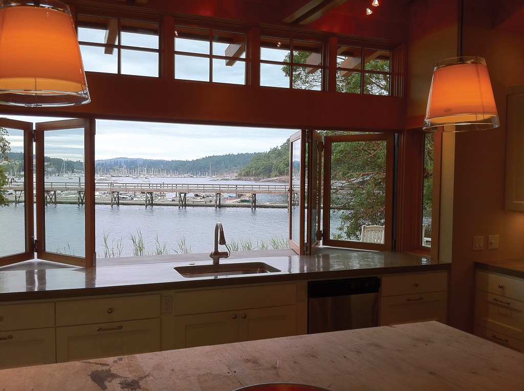 with three operable sashes. The large-format windows take advantage of a wall’s
